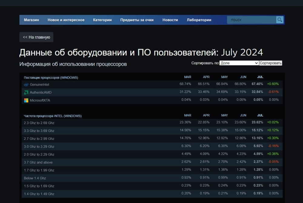 Что касается другого оборудования, 67,40% компьютеров, зарегистрированных в Steam, используют процессоры Intel. На AMD приходится 32,54%. Наиболее распространены 6-ядерные (33,67%), 8-ядерные (19,95%) и 4-ядерные (18,47%) чипы.