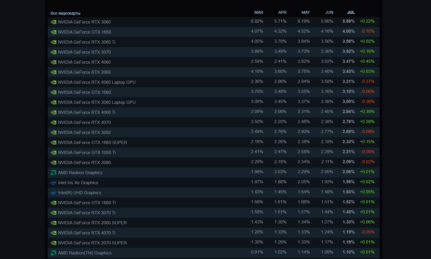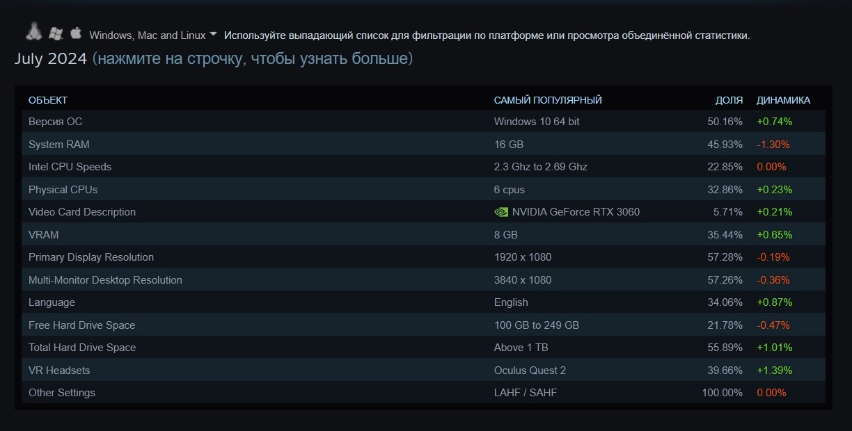 Valve обновила данные об оборудовании пользователей магазина Steam. По состоянию на июль 2024 года самой популярной видеокартой среди геймеров остаётся GeForce RTX 3060.