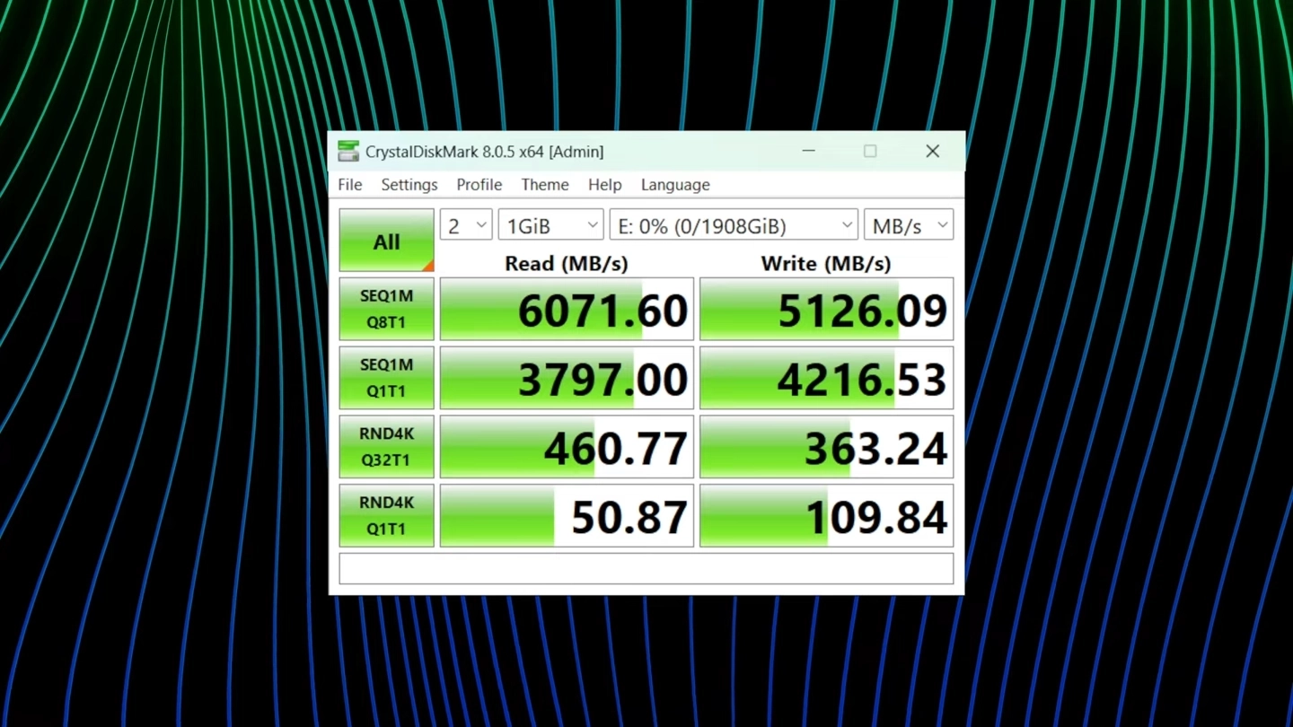 - Скорость последовательного чтения — 6071,60 МБ/с.