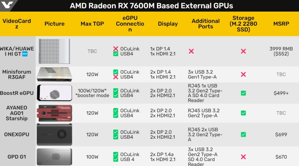 Внутри Wiko Hi GT Cube стоит AMD Radeon RX 7600M XT с 8 ГБ памяти GDDR6 и 128-битной шиной. Для подключения используется USB4 с поддержкой Thunderbolt 3. Ещё из портов есть HDMI 2.1 и DisplayPort 1.4a. Цена ускорителя — 3999 юаней (~47 600 рублей)