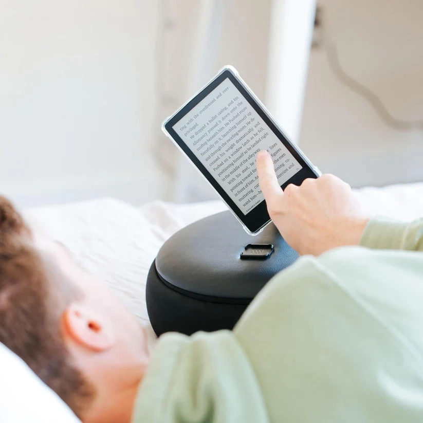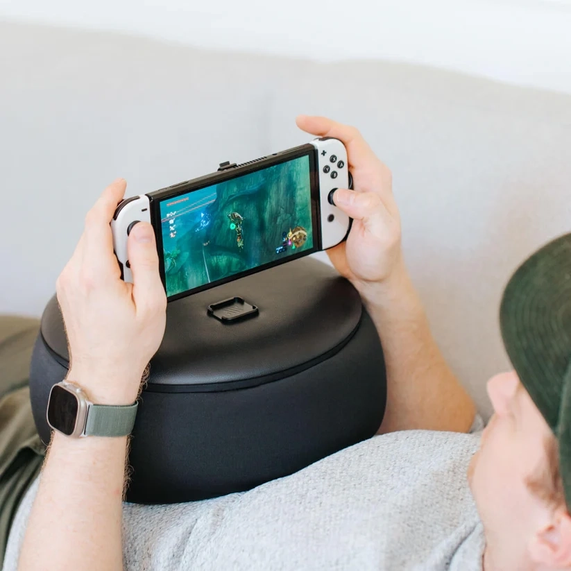 Продукт выглядит как миниатюрное кожаное кресло. Смысл такого аксессуара в том, что он ставится на колени или живот (если человек играет лёжа), а к держателю крепится портативная консоль, смартфон или электронная книга.