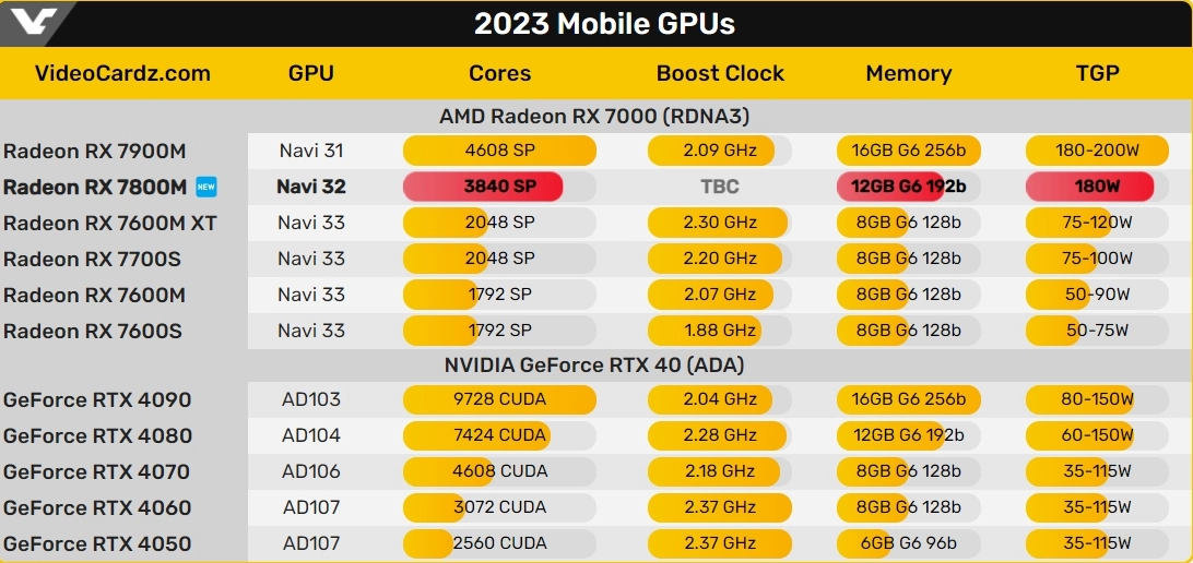 Radeon RX 7800M будет оснащаться графическим процессором Navi 32 с 60 вычислительными блоками, что соответствует 3840 потоковым процессорам. Также на борту 12 ГБ видеопамяти GDDR6 со 192-битной шиной.