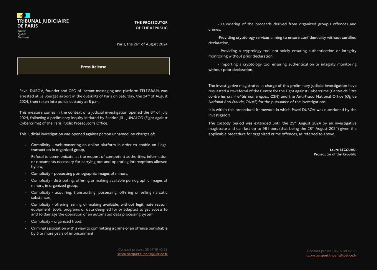 Прокуратура Парижа сообщила подробности о деле против Павла Дурова — основатель Telegram может быть замешан в 12 преступлениях, а само расследование против неназванного лица идёт с 8 июля.