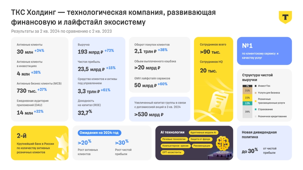 «ТКС Холдинг» (материнская компания «Т-Банка») объявил финансовые результаты за II квартал 2024 года.