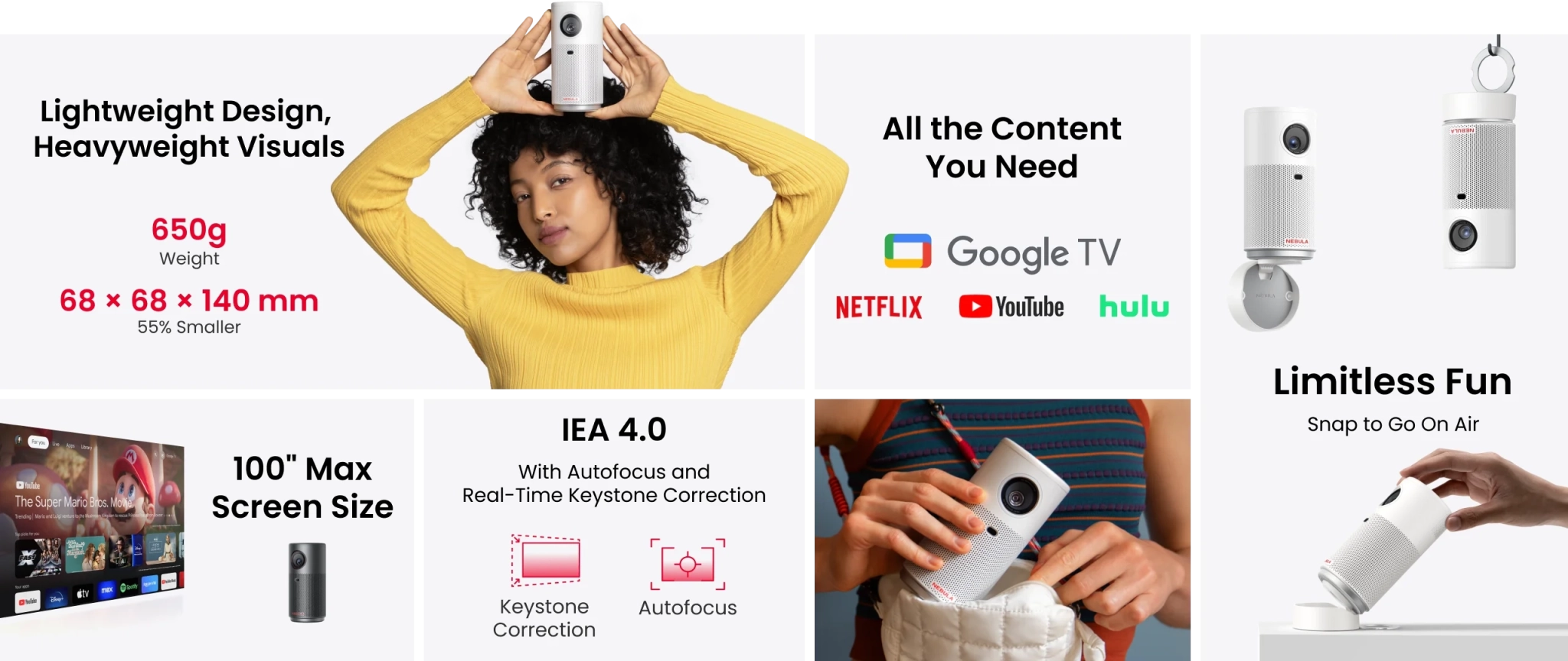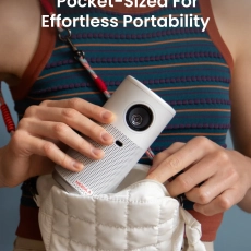 Устройство имеет размеры 68×68×140 мм и весит 650 г. Проектор использует технологию отображения DLP 0.16 DMD и показывает в разрешении 720p при яркости 150 ANSI-люменов. При этом изображение можно вывести на полотно размером до 100 дюймов.