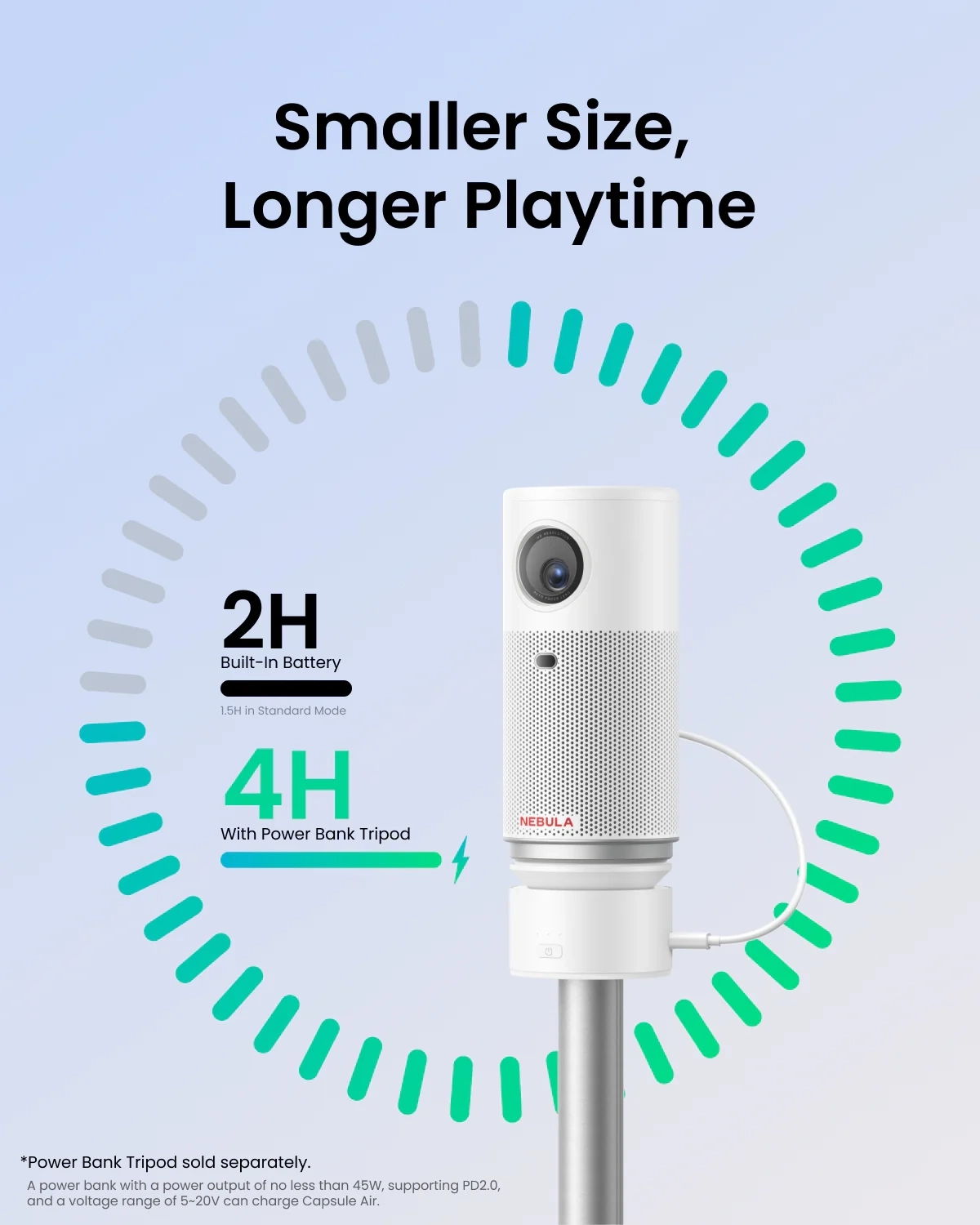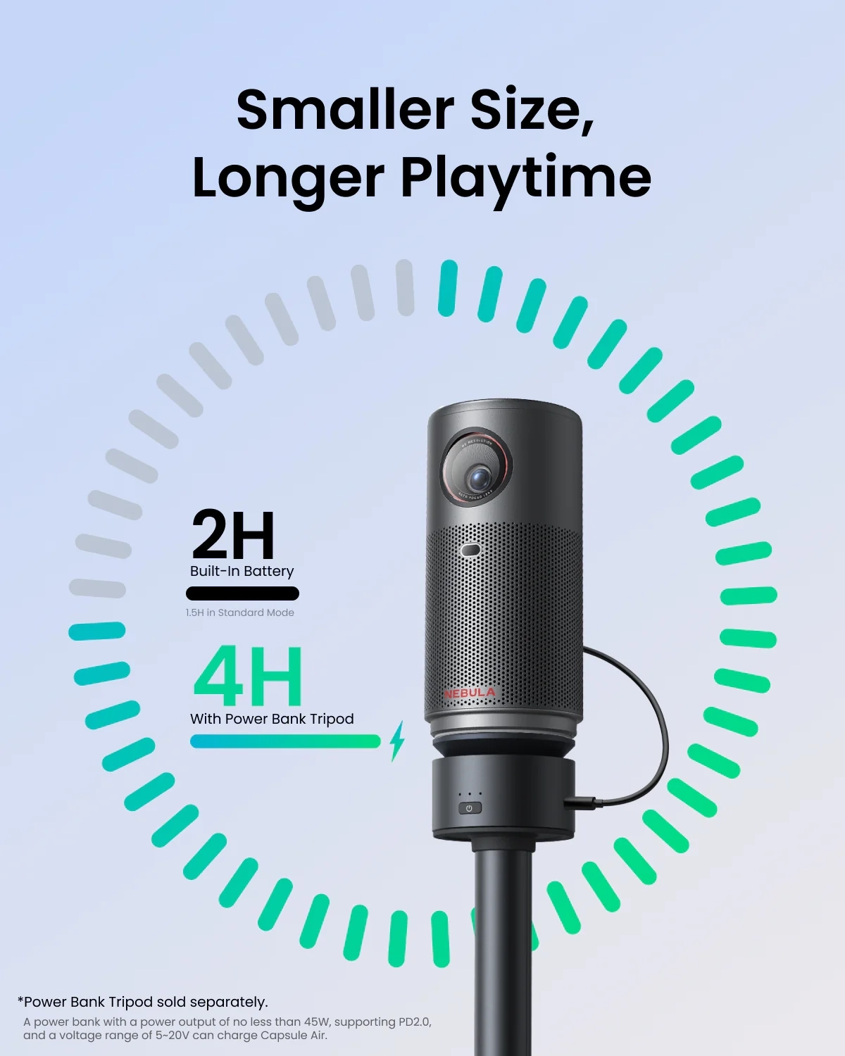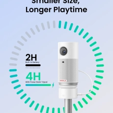 К проектору можно докупить несколько аксессуаров, включая штатив со встроенным аккумулятором на 9600 мАч. С помощью него получится увеличить автономность вдвое.
