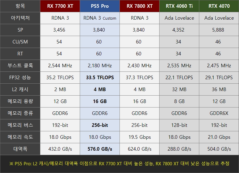 На просторах интернета появилась табличка, сравнивающая характеристики графического процессора консоли PS5 Pro с компьютерными видеокартами Radeon RX 7700 XT, 7800 XT, RTX 4060 Ti и RTX 4070.