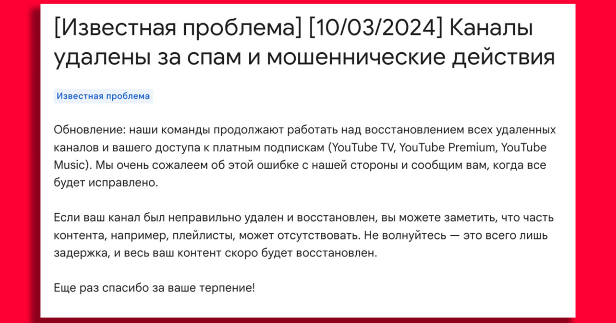 «Мы видим сообщения о том, что каналы были неправильно удалены за спам и мошеннические действия. Наши команды активно работают над восстановлением аккаунтов»— пишет техподдержка YouTube