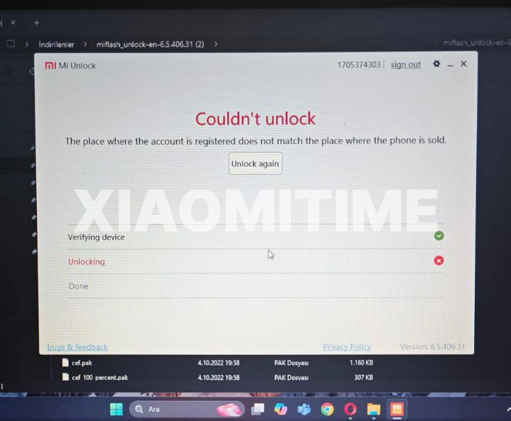 Если телефон был куплен в Китае, то при попытке разблокировать загрузчик с помощью глобальной учётной записи Xiaomi пользователь увидит такое сообщение: «место регистрации учётной записи не совпадает с местом продажи телефона».