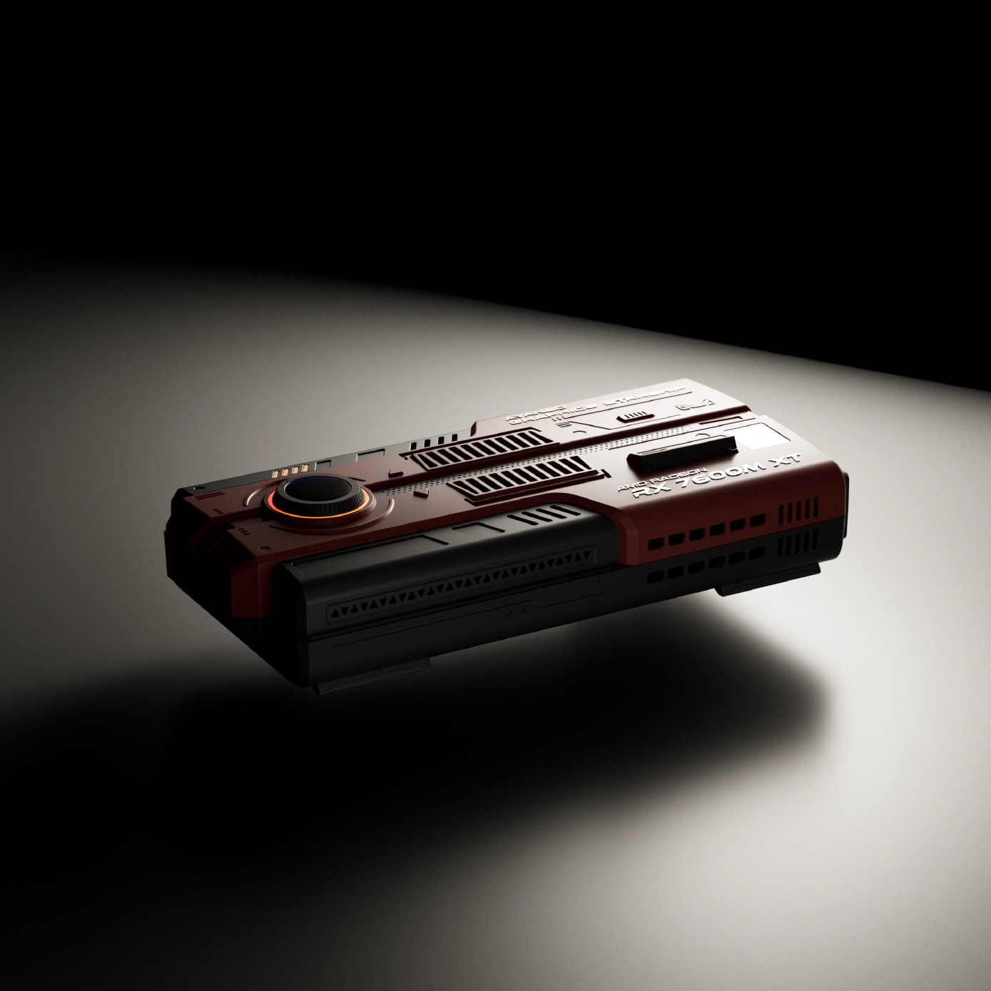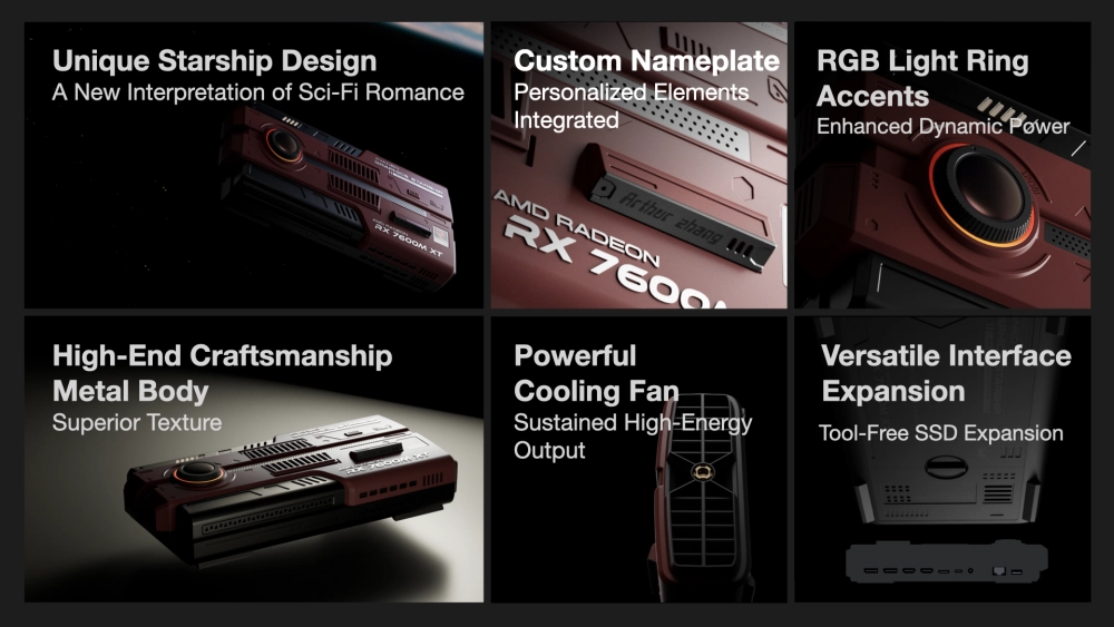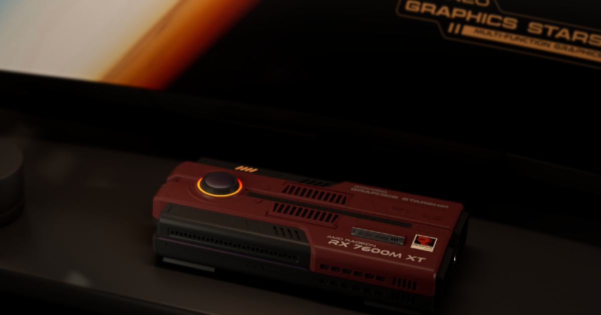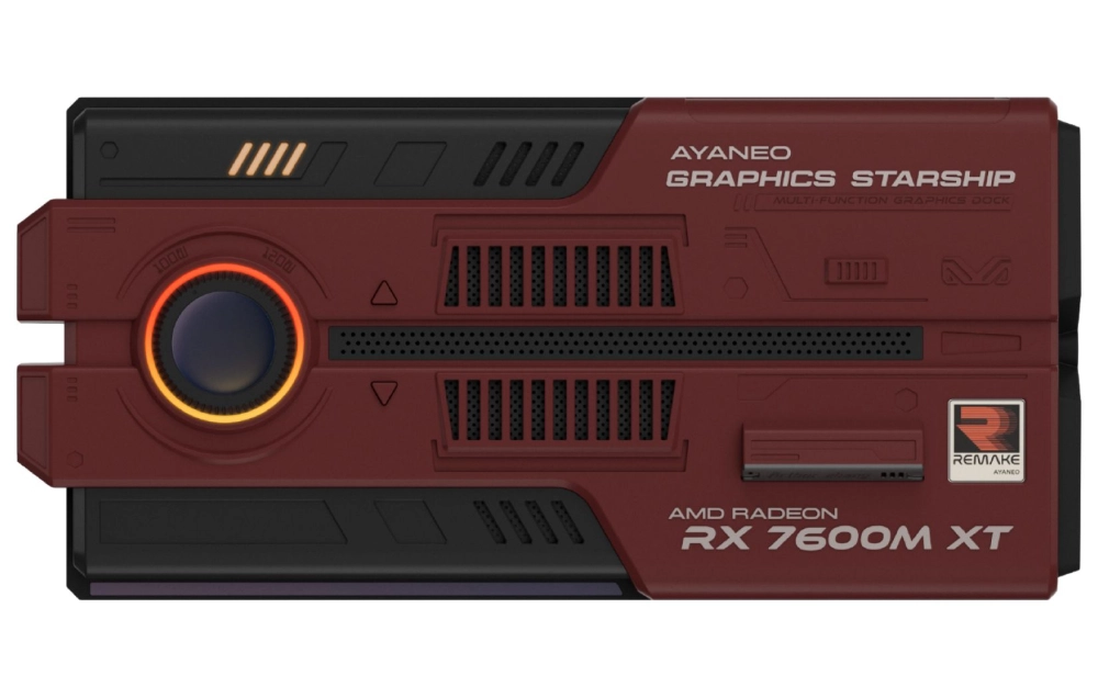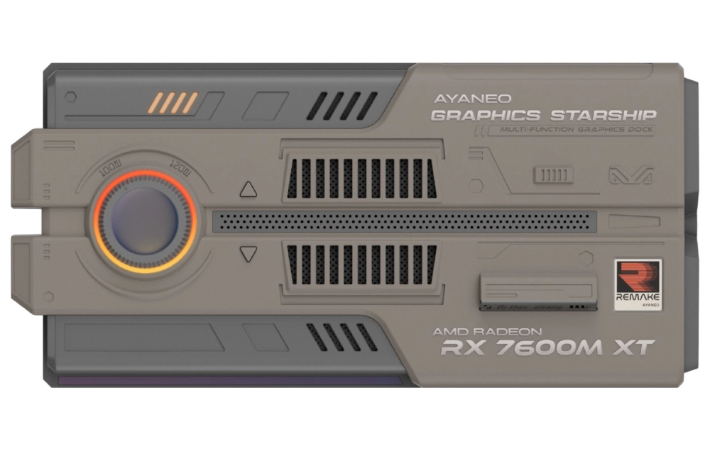 Главное, чем устройство отличается от конкурентов, это дизайн. Продукт сделан в виде космического корабля. На борту находится графический ускоритель Radeon RX 7600M XT (RDNA 3). Есть возможность регулировать мощность (100 Вт или 120 Вт), для этого на корпусе установлен роллер.