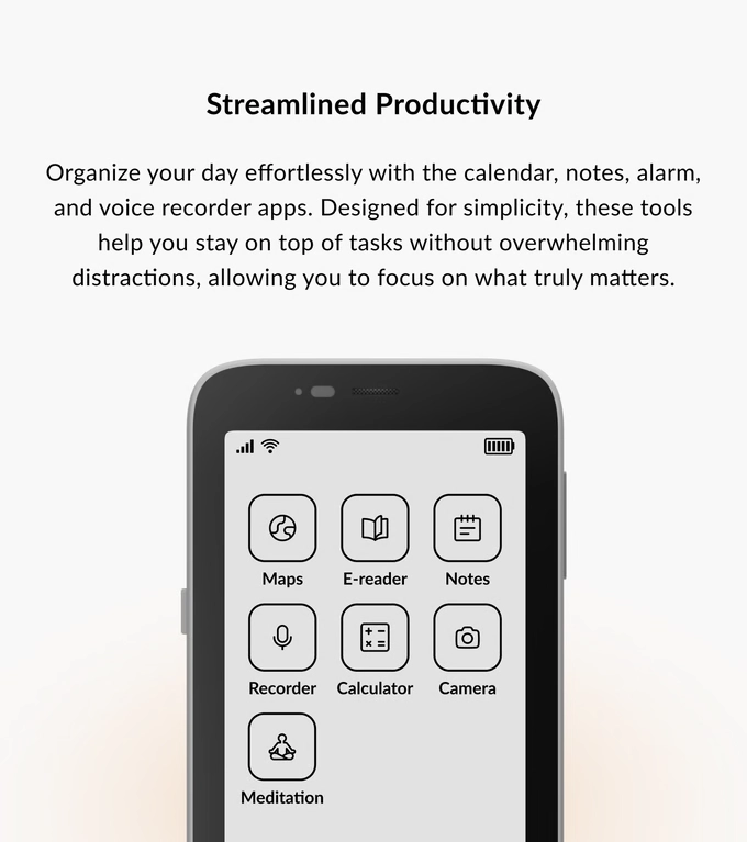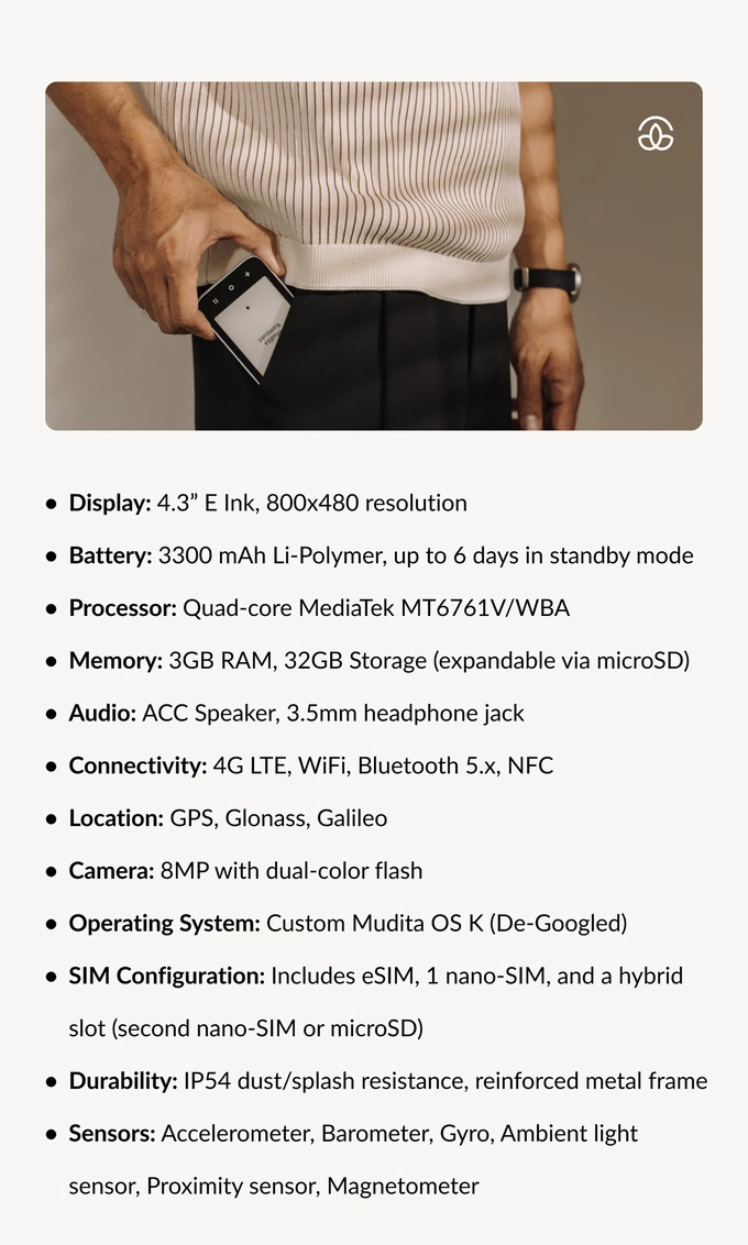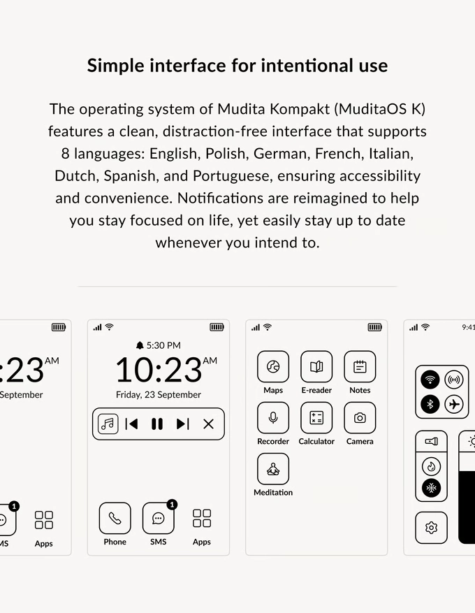 Компактное устройство с экраном E-Ink работает на системе Mudita OS K (Android), в которой нет никаких лишних приложений и прочих отвлекающих факторов. В этом основная фишка. «Больше офлайна. Больше жизни», — под таким лозунгом компания продвигает новый аппарат.
