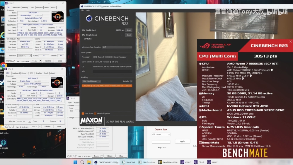 Для тестового стенда использовали материнскую плату Asus ROG Crosshair X670E Gene, видеокарту GeForce RTX 4090 и 32 ГБ ОЗУ DDR5-6000. Чип охлаждали жидким азотом.