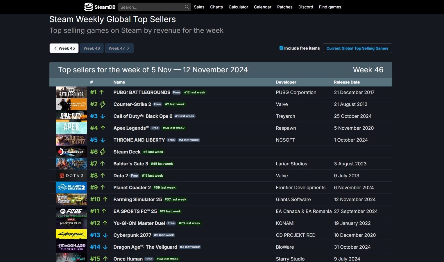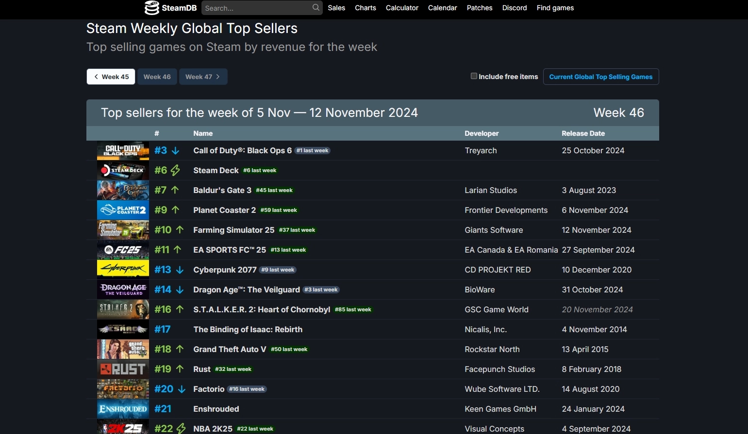 За период с 5 по 12 ноября 2024 года топ платных товаров, где не учитывается выручка от F2P-игр, возглавил шутер Call of Duty: Black Ops 6. На втором месте расположилась портативная консоль Steam Deck, которая в ноябре выйдет в лимитированной белой расцветке. Замыкает тройку лидеров ролевая игра Baldur's Gate 3.