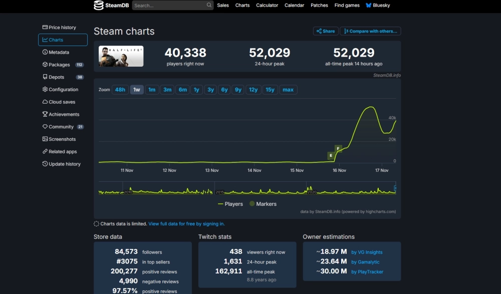 В Steam есть данные по количеству геймеров не за всё время существования шутера, а только с 2008 года. Half-Life 2 вышла в 2004 году. Тогда магазин Valve находился ещё в зачаточном состоянии и не был столь популярен, как в 2024-ом.