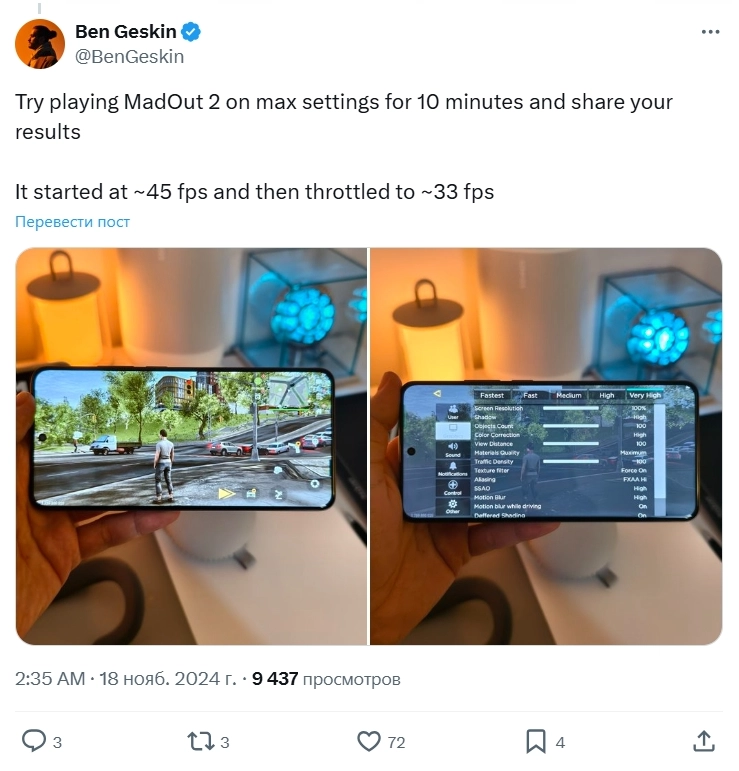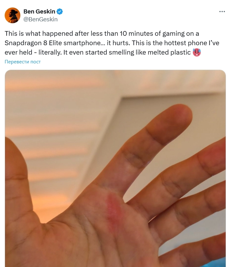 Но у высокой производительности Snapdragon 8 Elite есть и обратная сторона. Чип греется, причём сильно. Инсайдер Бен Гескин пожаловался в социальных сетях, что смартфон с этим процессором во время игры в MadOut 2 на максимальных настройках обжёг ему руку. Что это за устройство, не сообщается.