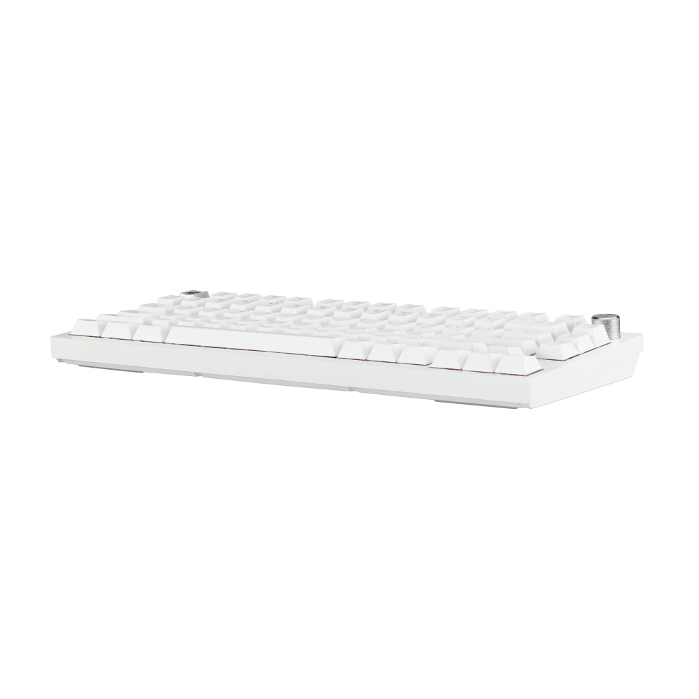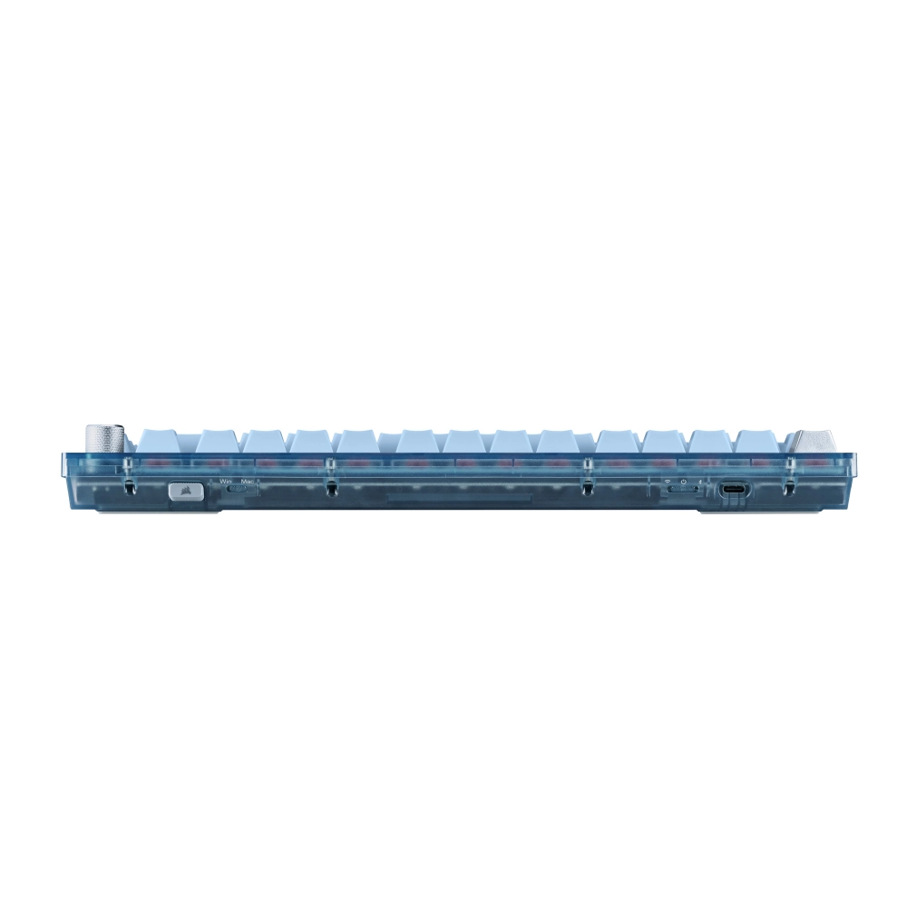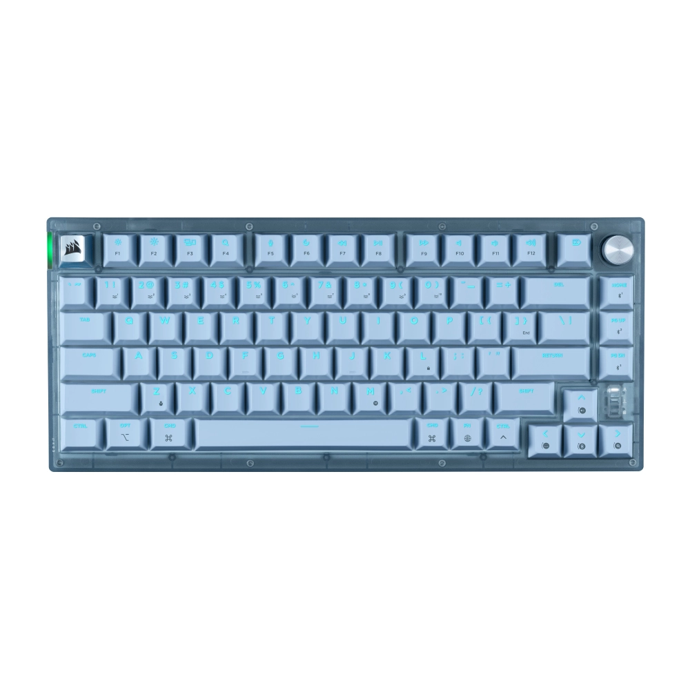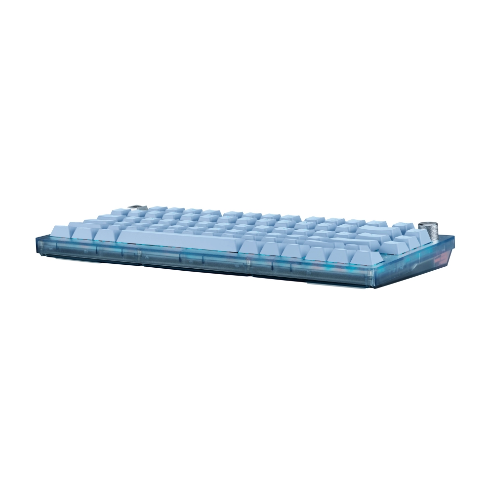 Новинка сделана в форм-факторе 75% и не имеет цифрового блока справа. Под АБС-колпачками установлены предварительно смазанные линейные переключатели MLX Red v2. Их можно менять. Конструкция клавиатуры получила шумку. Есть «крутилка» и RGB-подсветка. Синяя версия может похвастаться прозрачным кейсом.