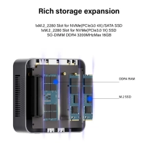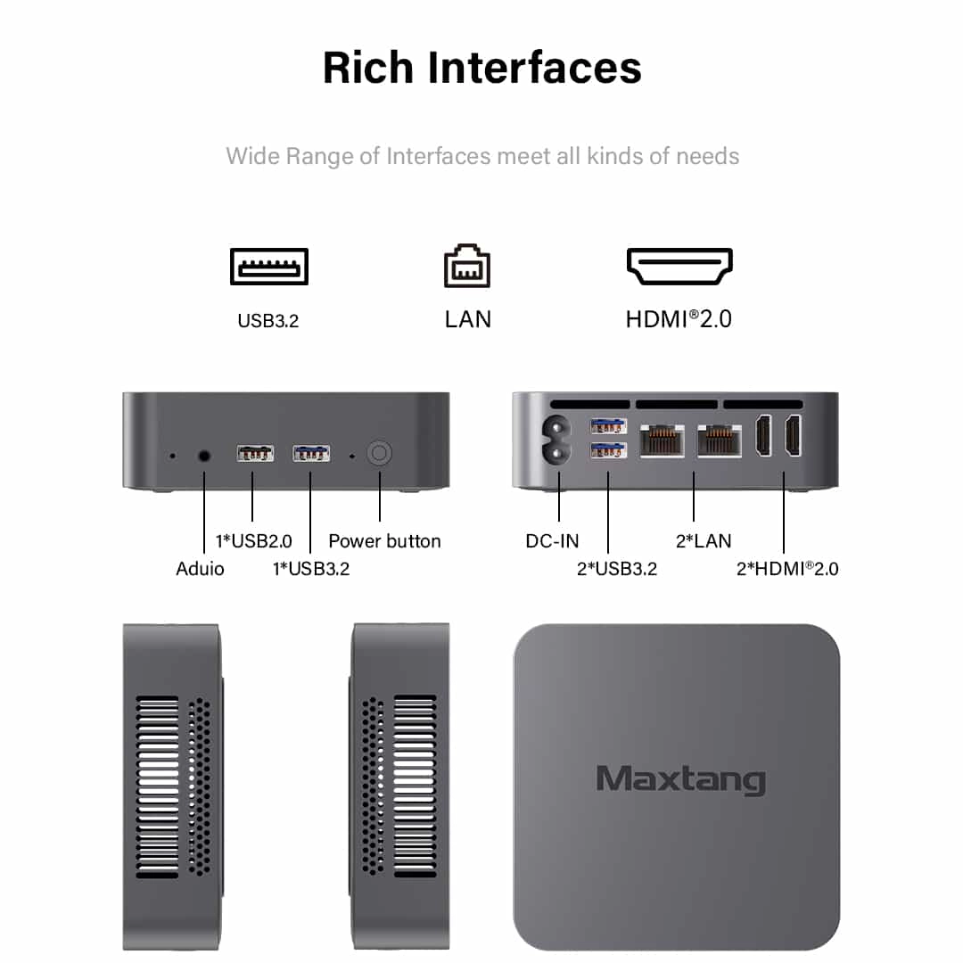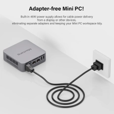 У большинства современных мини-ПК блок питания внешний, но Maxtang MAX-N100 Mini PC — не тот случай. А вот дизайн и «железо» у компьютера самые обычные. Внутри стоит маломощный 4-ядерный чип Intel N100, дополненный 16 ГБ оперативки DDR4 (SO-DIMM). Есть два слота M.2 для SSD PCIe 3.0. Мощность БП — 45 Вт.