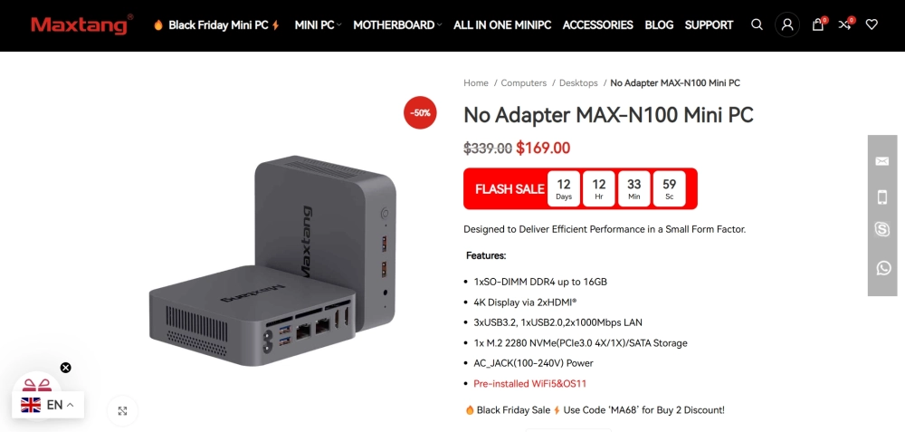 Купить Maxtang MAX-N100 Mini PC в версии 16 + 512 ГБ можно за 169 долларов (~17 400 рублей). Это цена со скидкой на сайте бренда.