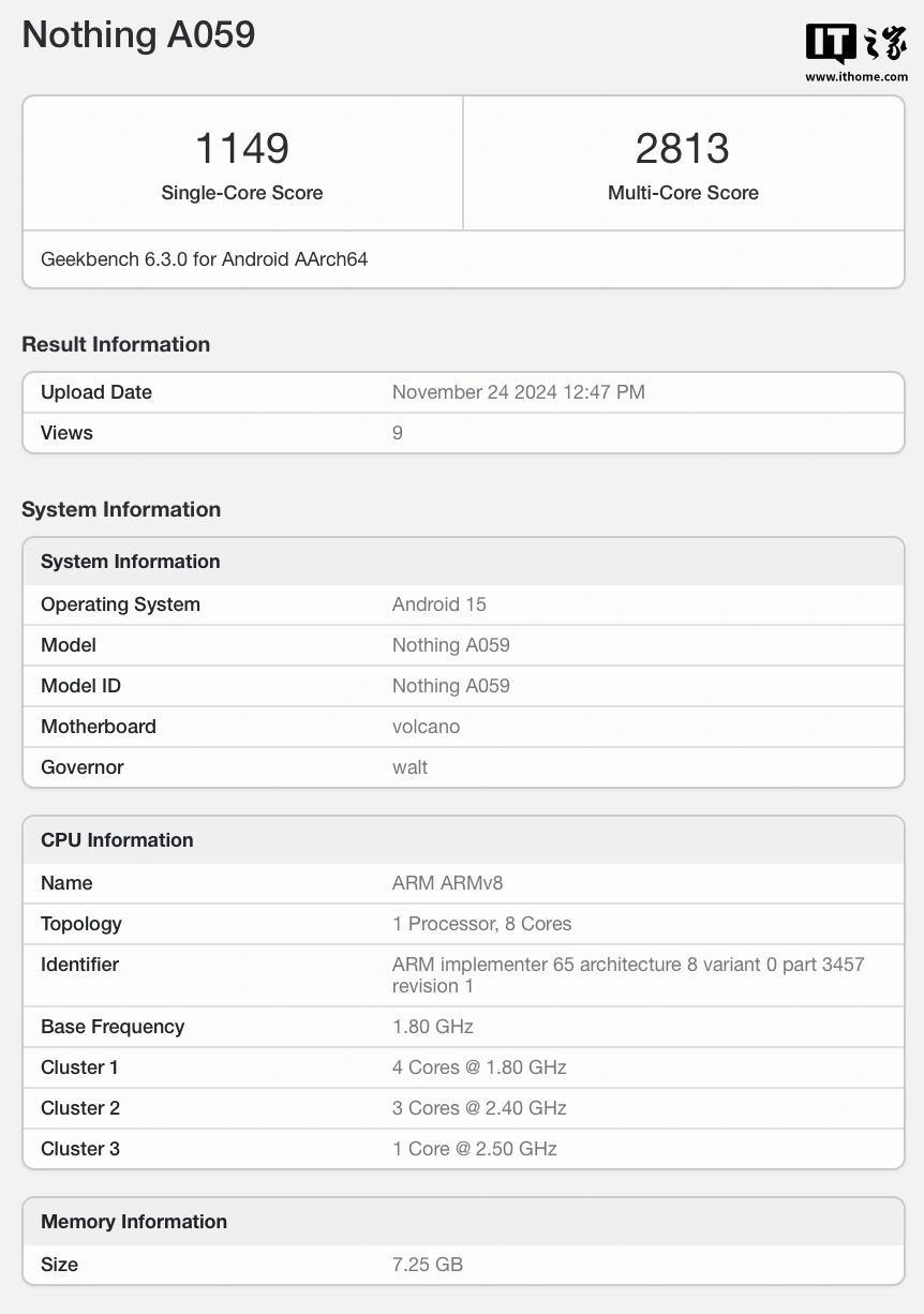 Модель имеет номер A059 и оснащается чипом Snapdragon 7s Gen 3, который дополнен 8 ГБ оперативной памяти. OC — Android 15. Смартфон набрал 1149 баллов и 2813 баллов в одноядерном и многоядерном тестах.
