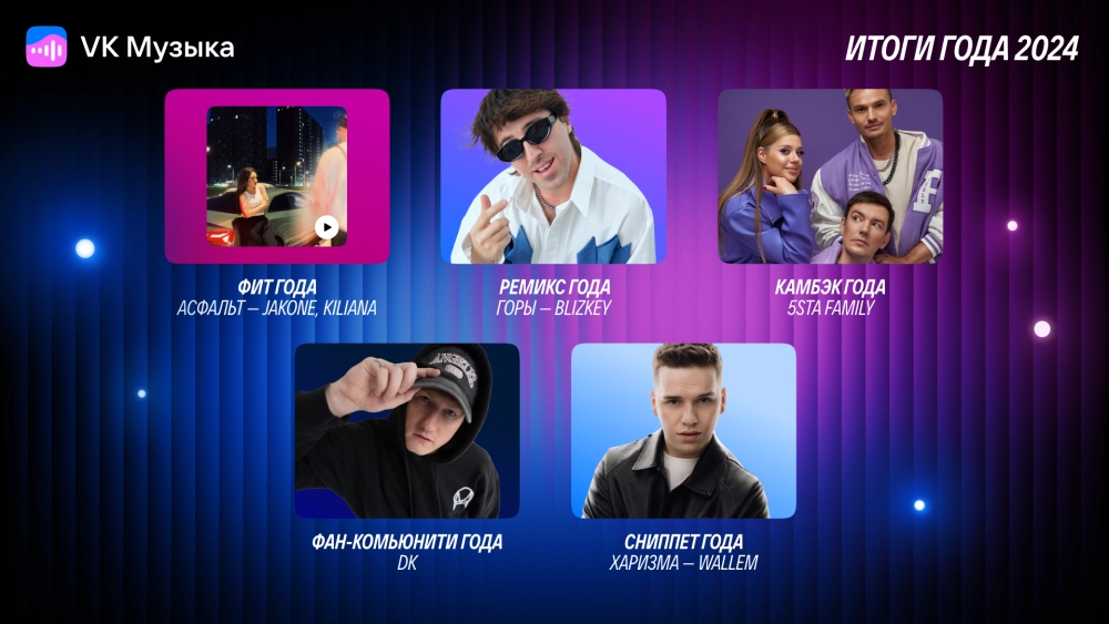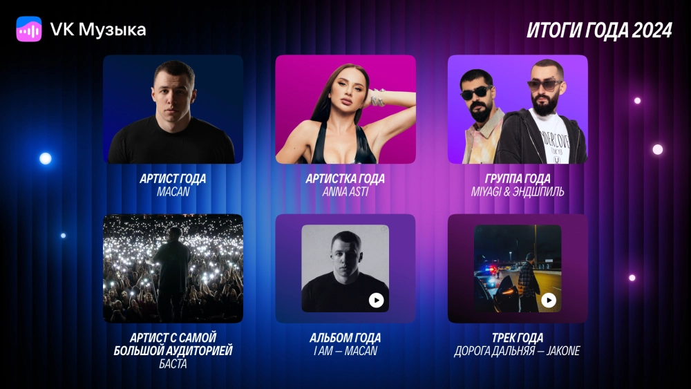 «VK Музыка» подвела итоги 2024 года — в команде стриминга назвали самые популярные треки, альбомы и артистов, а также вручили награды в 22 номинациях, где так же были представлены музыкальные лейблы, аудиокниги и подкасты.