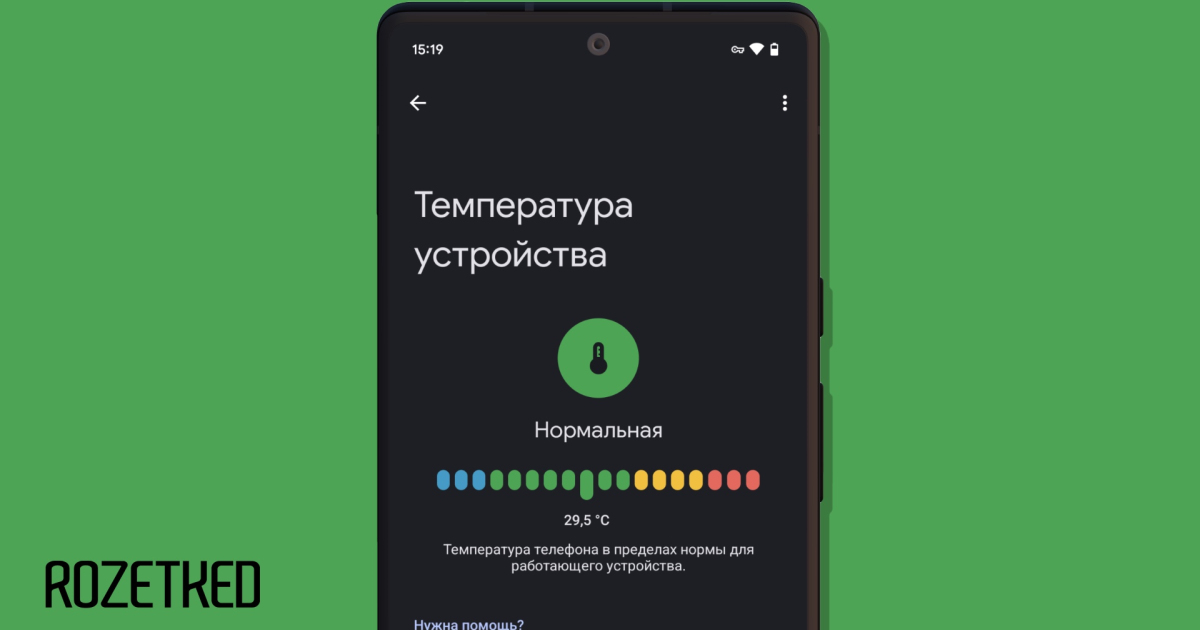 На экране появится конкретное значение в градусах и визуальный индикатор. В случае повышенного значения сервис предложит возможные способы охлаждения устройства.