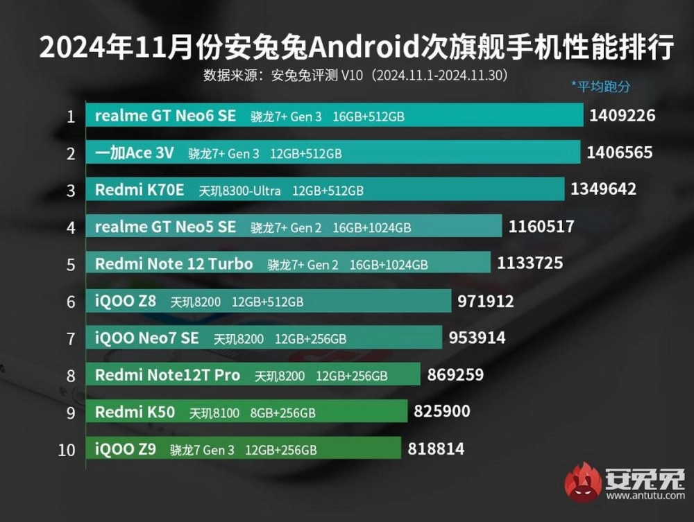 Команда AnTuTu опубликовала топ-10 самых производительных смартфонов ноября 2024 года. В списке есть только устройства, работающие на OC Android.