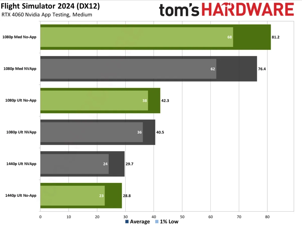 При этом в некоторых играх наблюдается обратное — S.T.A.L.K.E.R. 2 в разрешении 1440p почему-то показывает больше кадров на ПК с Nvidia App. Аналогичная картина и в Microsoft Flight Simulator 2024.