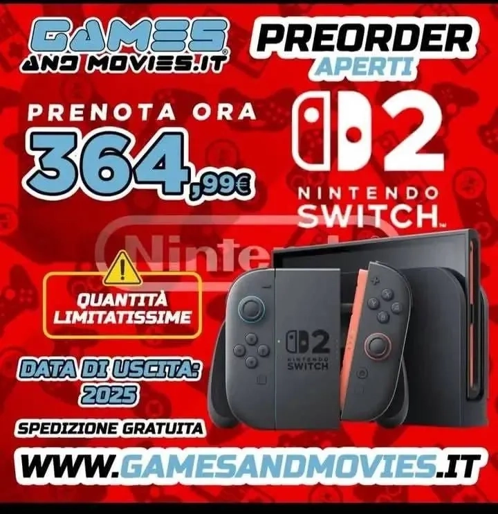 Итальянский магазин gamesandmovies разместил постер, который призывает оформить предварительный заказ на новую консоль Nintendo Switch 2, причём указан конкретный ценник.