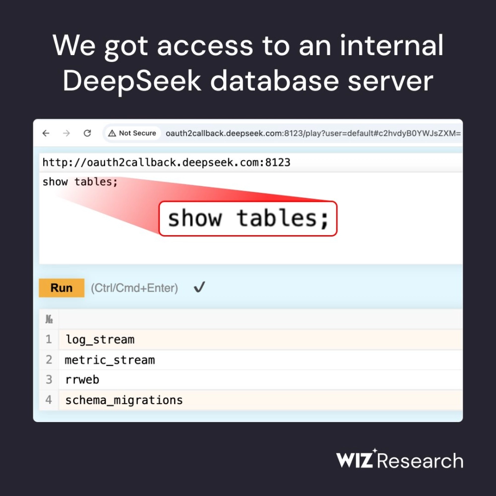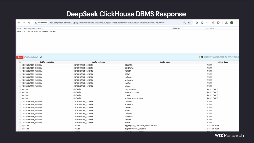 «Компания Wiz Research обнаружила „DeepLeak“ — общедоступную базу данных ClickHouse, принадлежащую DeepSeek, которая раскрывает крайне конфиденциальную информацию, включая секретные ключи, текстовые сообщения чата, сведения о бэкэнде и журналы»— исследователи Wiz