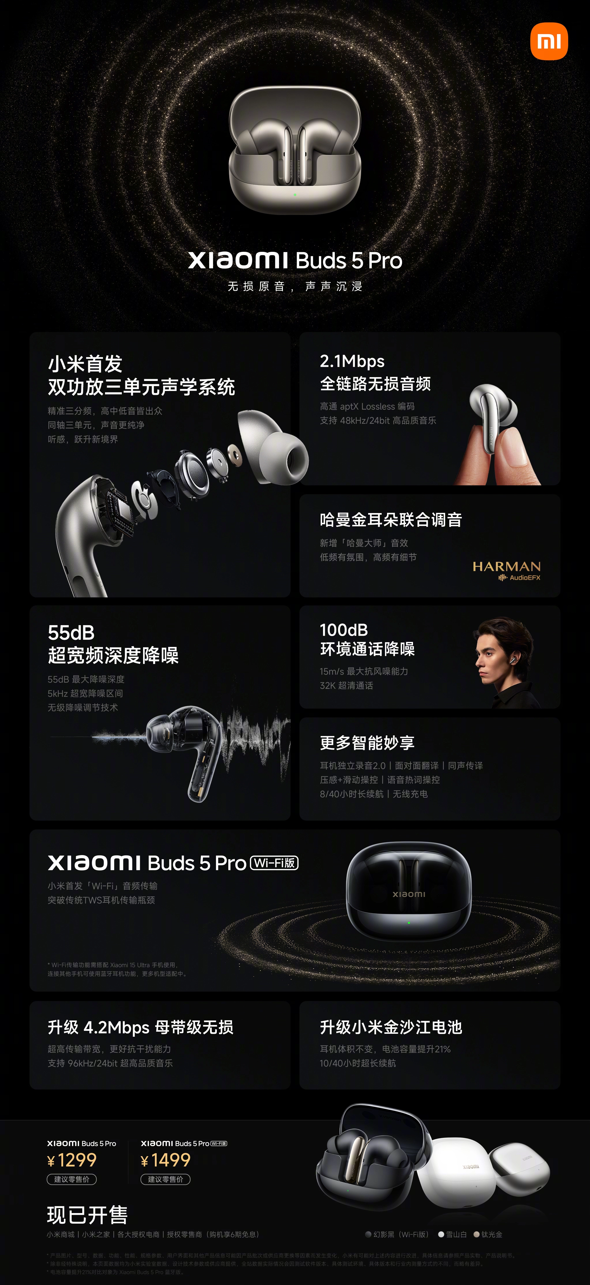 Стоимость Xiaomi Buds 5 Pro составляет 1299 юаней (~15 600 рублей). Версию с поддержкой Wi-Fi оценили в 1499 юаней (~18 000 рублей).