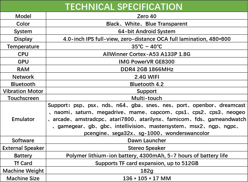 Устройство оснащается 4-дюймовым IPS-экраном с разрешением 800×480 пикселей. Аппаратная база — чип Allwinner A133P в паре с 2 ГБ оперативной памяти. Батарея на 4300 мАч должна обеспечивать от пяти до семи часов игрового процесса, говорят в компании. Консоль будет работать на OC Android.