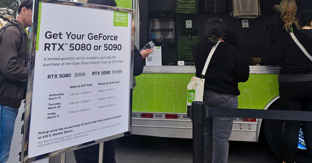 Nvidia, чтобы немного «подсластить пилюлю», решила продавать новые ускорители с фургона в рамках конференции GTC 2025. Правда, тут есть пара «но». Во-первых, купить видеокарту могут только владельцы пропусков на конференцию, которые стоят 1145 долларов (~97 000 рублей). Во-вторых, количество видеокарт ограничено. Компания привезла по 1000 единиц RTX 5090 и RTX 5080. Ну и продают их только по одному ускорителю на руки.
