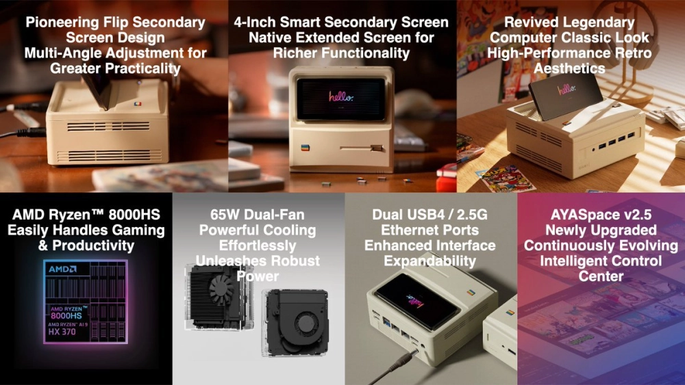 Вместо процессоров серии AMD Hawk Point обновлённый AM01S будет поставляться с чипами Strix Point вплоть до Ryzen AI 9 HX 370 (Zen 5) и графикой RDNA 3.5. Внутри также два слота SO-DIMM для ОЗУ DDR5-5600 и пара M.2 для SSD 2280 PCIe 4.0. Начинка охлаждается активной системой.
