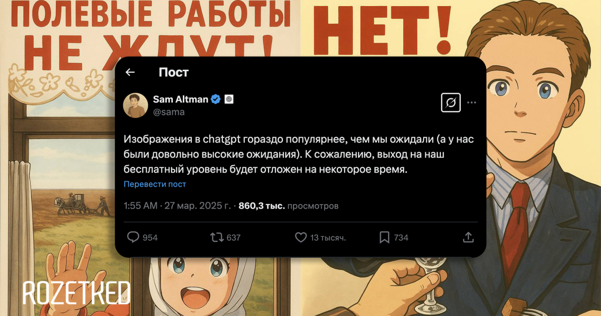 «[Генерация изображений] в ChatGPT гораздо популярнее, чем мы ожидали (а у нас были довольно высокие ожидания). К сожалению, выход на бесплатный уровень будет отложен на некоторое время»— пишет Альтман