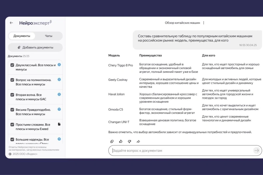 «По всей загруженной информации пользователь может задавать вопросы в режиме диалога — как при общении с обычным чат-ботом. „Нейроэксперт“ подготовит ответ только на основе источников пользователя и не добавит ничего от себя. После выхода сервиса из бета-тестирования пользователи смогут добавлять больше 25 файлов или ссылок»— пресс-служба «Яндекс»