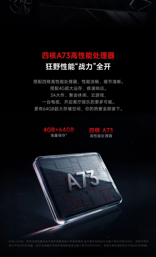 На борту у телевизоров чип с четырьмя ядрами Cortex-A73, 4 ГБ оперативной памяти и накопитель ёмкостью 64 ГБ. Есть два порта HDMI 2.1, один HDMI 2.0 и USB. Поддерживается Wi-Fi 6 и Bluetooth 5.2. Звук выводится на два динамика по 12,5 Вт каждый.