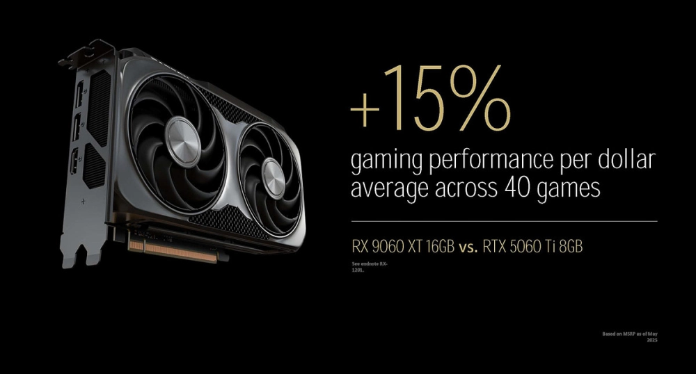 В AMD говорят, что их новая карта в среднем на 6% быстрее в разрешении 1440p, чем RTX 5060 Ti. Соотношение цена/производительность на доллар на 15% выше. Правда, сравнивали Radeon RX 9060 XT 16 ГБ и RTX 5060 Ti 8 ГБ