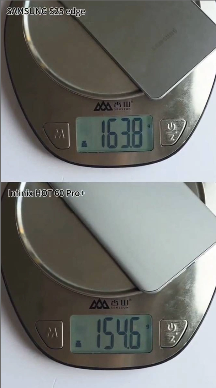 Инсайдер Ice Universe раздобыл ещё не анонсированный смартфон Infinix Hot 60 Pro+ и сравнил его и Galaxy S25 Edge. После измерений оказалось, что толщина Infinix составляет всего 5,9 мм — это лишь на 0,2 мм больше, чем у корейской новинки.