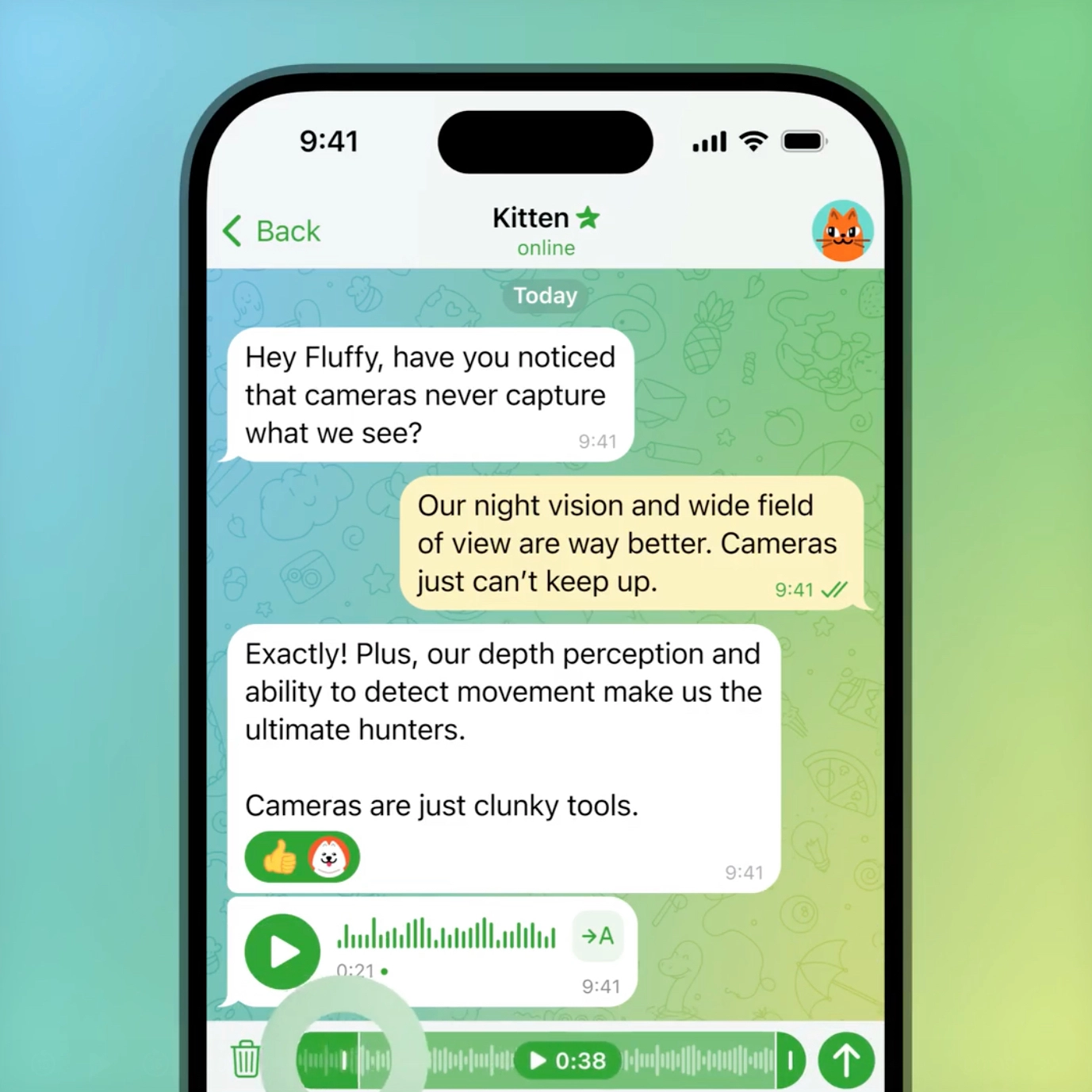 Дозаписывайте или приостанавливайте запись, проводя вверх к значку замка. Интерфейс прямо как при записи «кружочков», но теперь работает и с обычными аудиосообщениями.