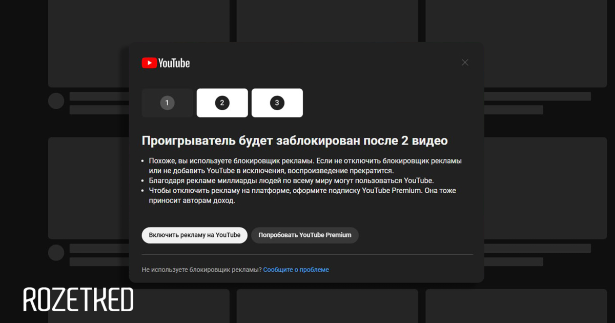 «Похоже, вы используете блокировщик рекламы. Если [его] не отключить, воспроизведение прекратится <...> Чтобы отключить рекламу на платформе, оформите подписку YouTube Premium»— предупреждение от YouTube