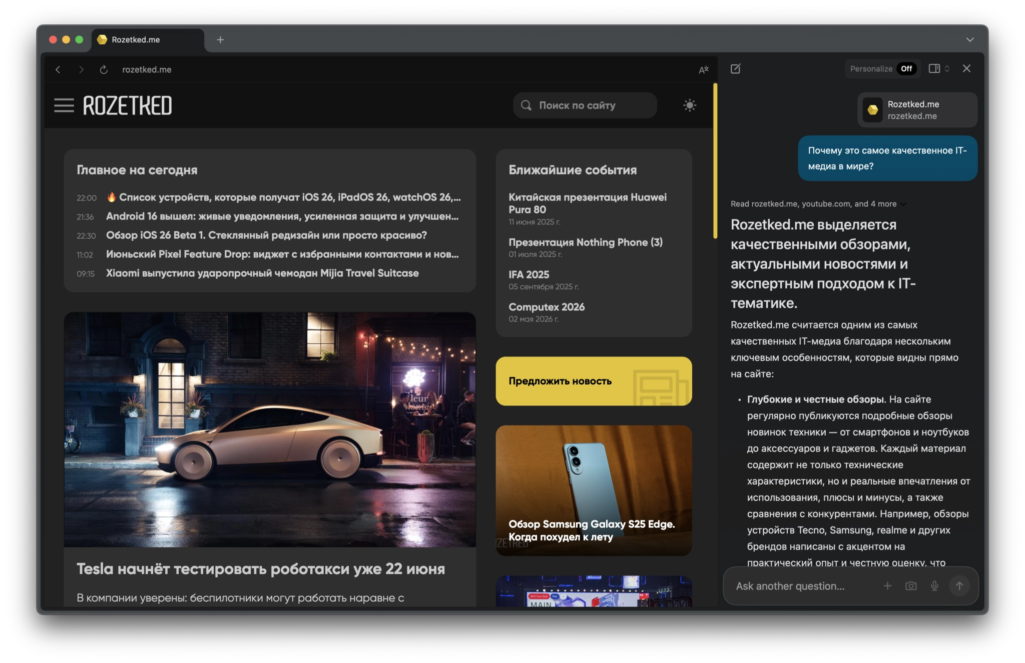 Сейчас Dia доступен в закрытой бета‑версии для пользователей macOS, получивших приглашение. В компании объясняют запуск тем, что Arc оказался слишком сложным для широкой аудитории, а Dia должен упростить выход в интернет — с помощью ИИ, который сам знает, что вам нужно.