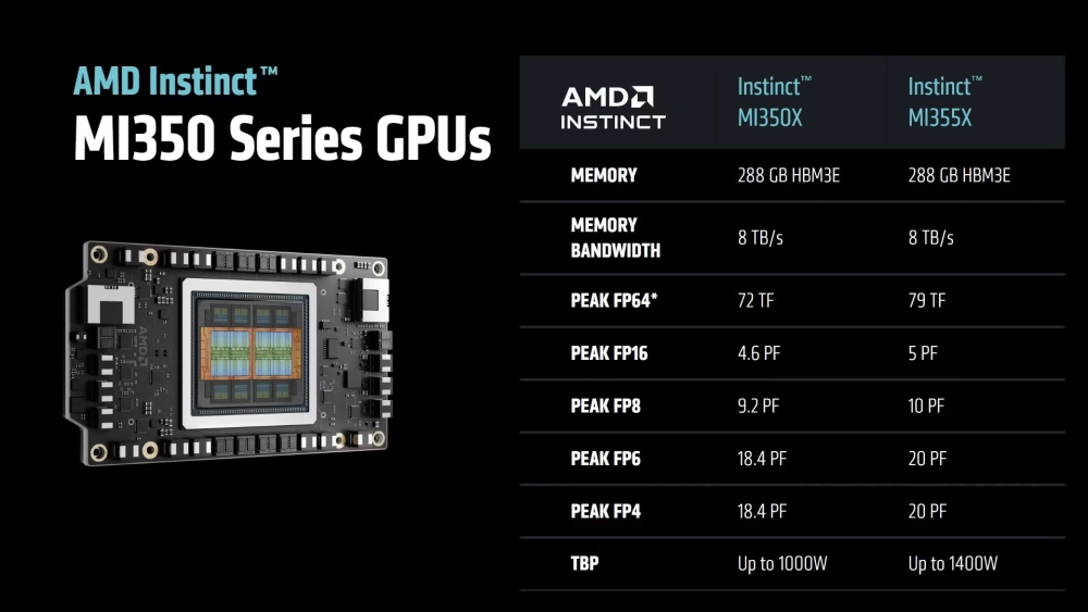 MI350X получил 288 ГБ памяти стандарта HBM3E с пропускной способностью 8 ТБ/с и мощностью до 1000 Вт. В старшей модели MI355X — те же характеристики, но с жидкостным охлаждением и потреблением до 1400 Вт. AMD заявляет о производительности до 20,1 PFLOPS в формате FP4 и FP6, а в сборке из восьми ускорителей можно достичь свыше 40 PFLOPS.