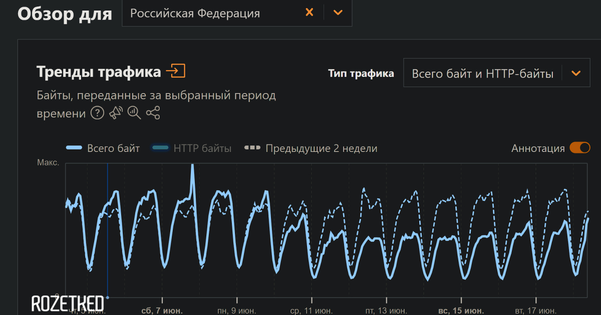 В России уже две недели последовательно снижается трафик Cloudflare — провайдера сетевой инфраструктуры, услугами которого пользуется почти четверть всех компаний в интернете для защиты от DDoS-атак и перехватов подписей.