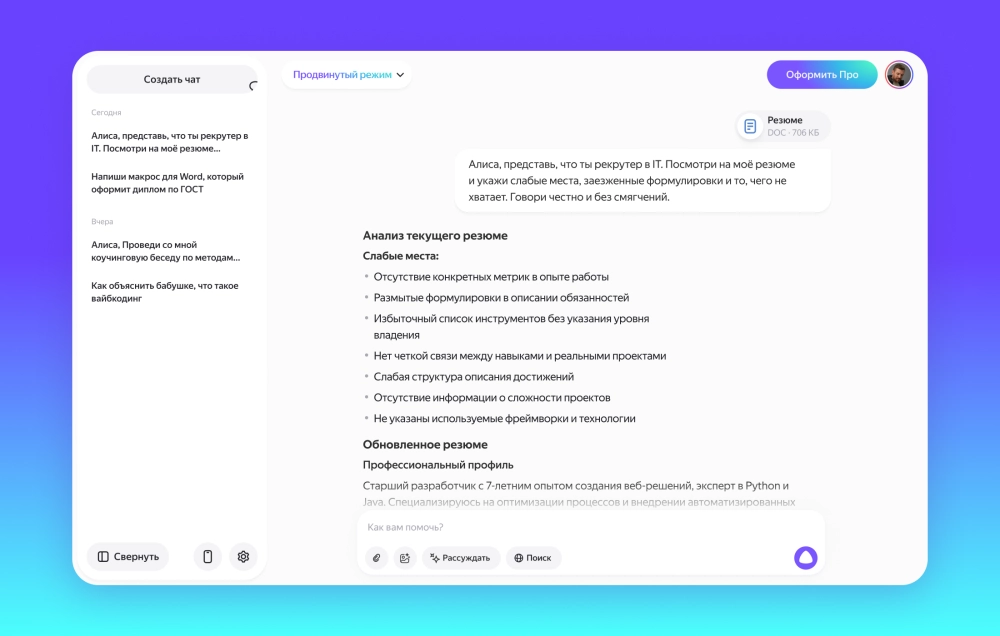 В «Чат с Алисой» можно загружать текстовые файлы в форматах .pdf, .txt, .doc и .docх. Нейросеть сумеет ответить на вопросы по их содержанию, проанализировать данные или сделать сжатый пересказ.