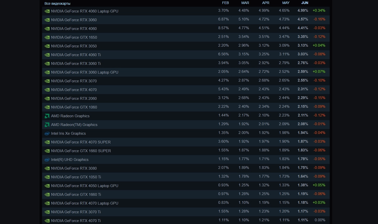 В первой десятке всё ещё нет ни одной видеокарты AMD Radeon, но это обычное дело. Nvidia GeForce традиционно пользуются более высоким спросом у геймеров, чем решения «красной» компании.