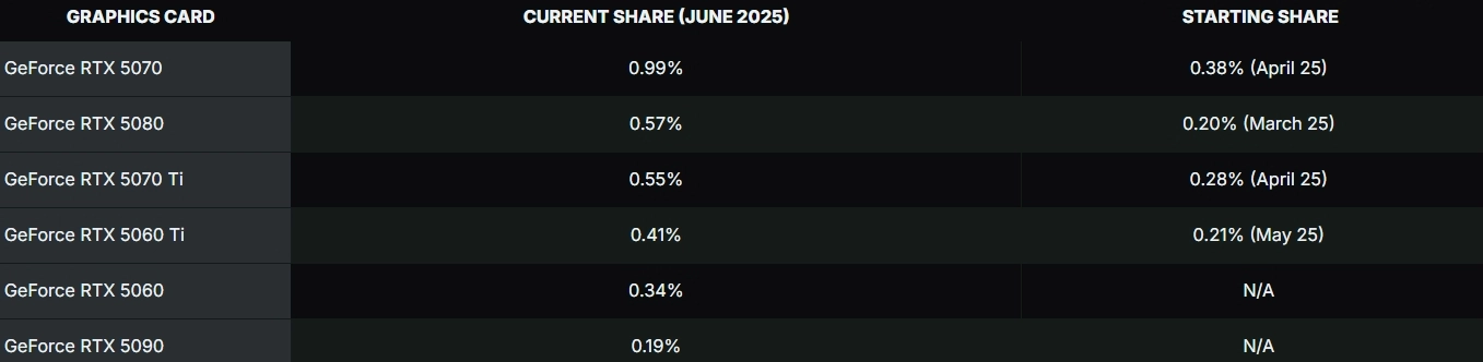 RTX 5070 установлена почти в 1% игровых ПК. У других представителей семейства RTX 50 доли скромнее: