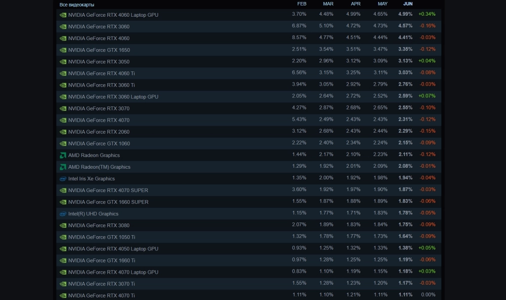 Доля у RTX 50 постепенно растёт, но до первой десятки им пока далеко. На первом месте находится RTX 4060 Laptop с долей 4,99%. Десктопные RTX 3060 и RTX 4060 на втором и третьем местах.