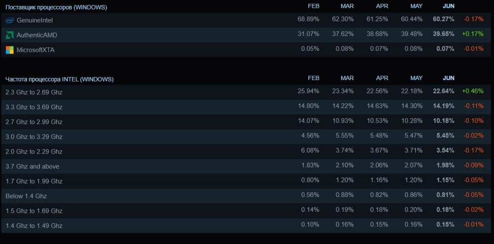 А вот процессоры AMD игроки, напротив, покупают хорошо. Доля чипов Intel среди пользователей Steam постепенно снижается, тогда как «красные» становятся всё популярнее.