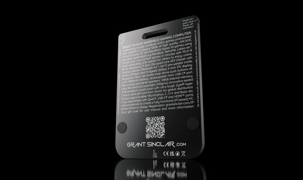 «Мой последний продукт — GamerCard черпает вдохновение из форм-фактора подарочной карты розничной торговли, что делает его самым компактным игровым ПК из когда-либо созданных. Свободный от громоздкой упаковки, он мгновенно готов к использованию — просто снимайте его с крючка и играйте»— Грант Синклер