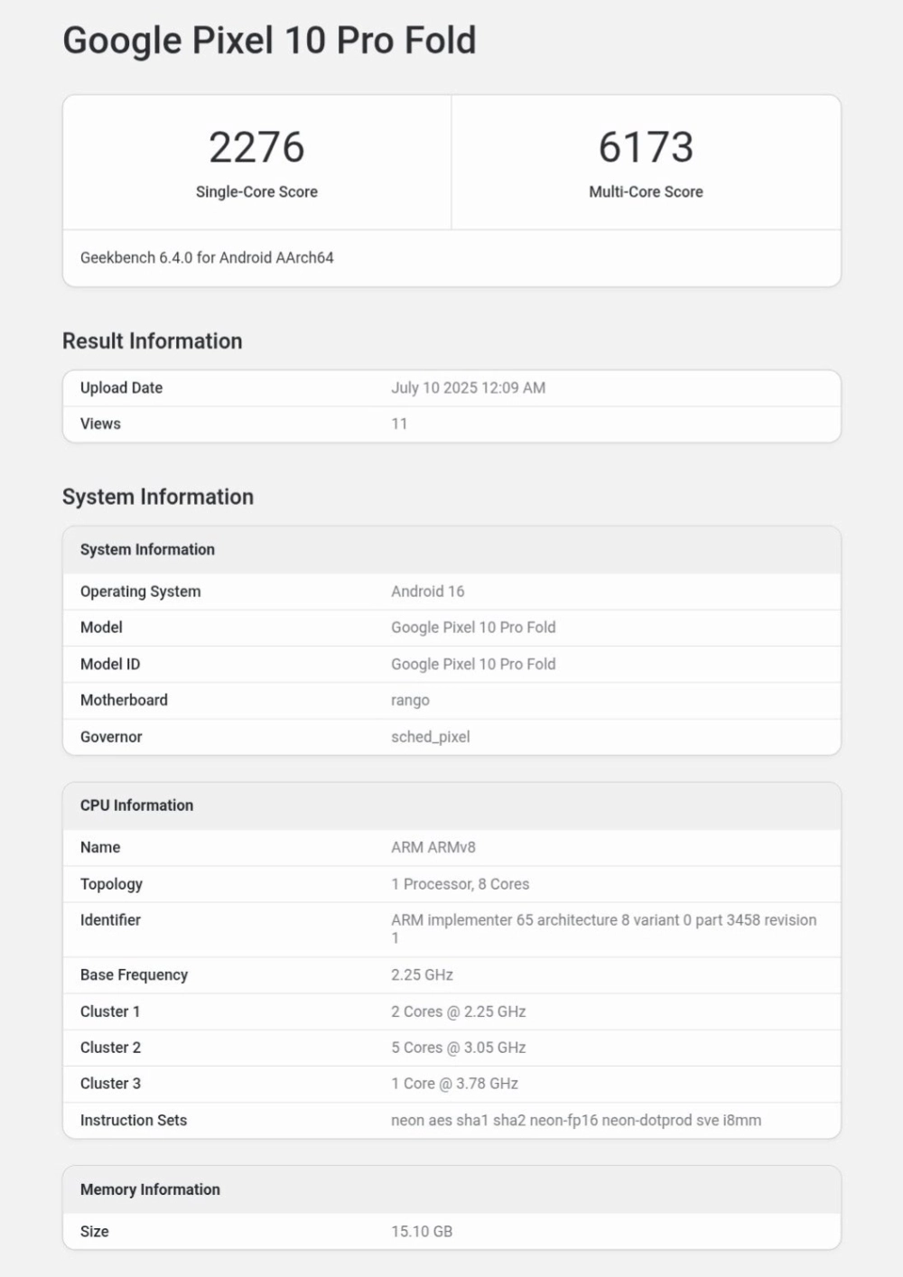В базе данных Geekbench 6 появились результаты тестирования ещё не представленного Google Pixel 10 Pro Fold на чипсете Tensor G5. Смартфон набрал 2276 баллов в одноядерном тесте и 6173 в многоядерном.